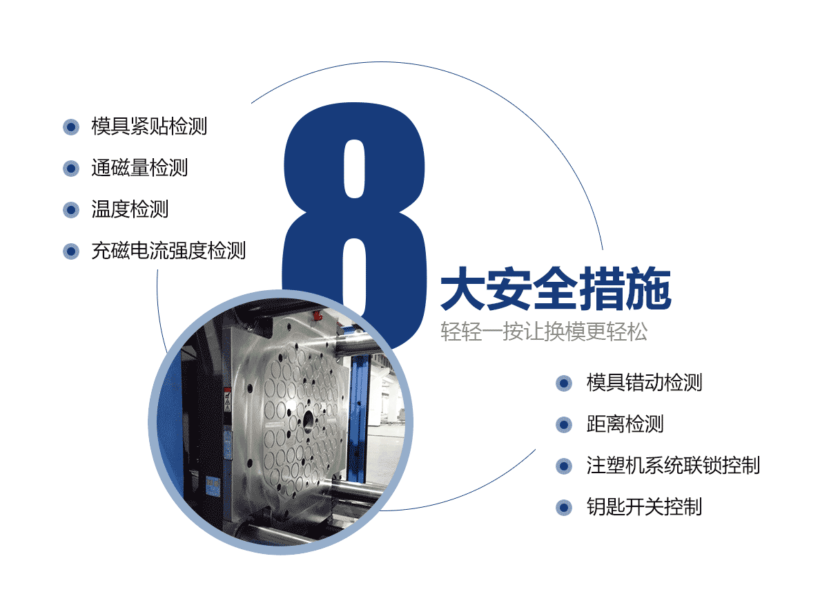 電永磁磁力模板大大提高注塑機(jī)換模效率。 自動化注塑機(jī)的換模方法僅需3分鐘即可完成。特大型注塑機(jī)模板的換模時(shí)間從超過2小時(shí)減少到10分鐘。